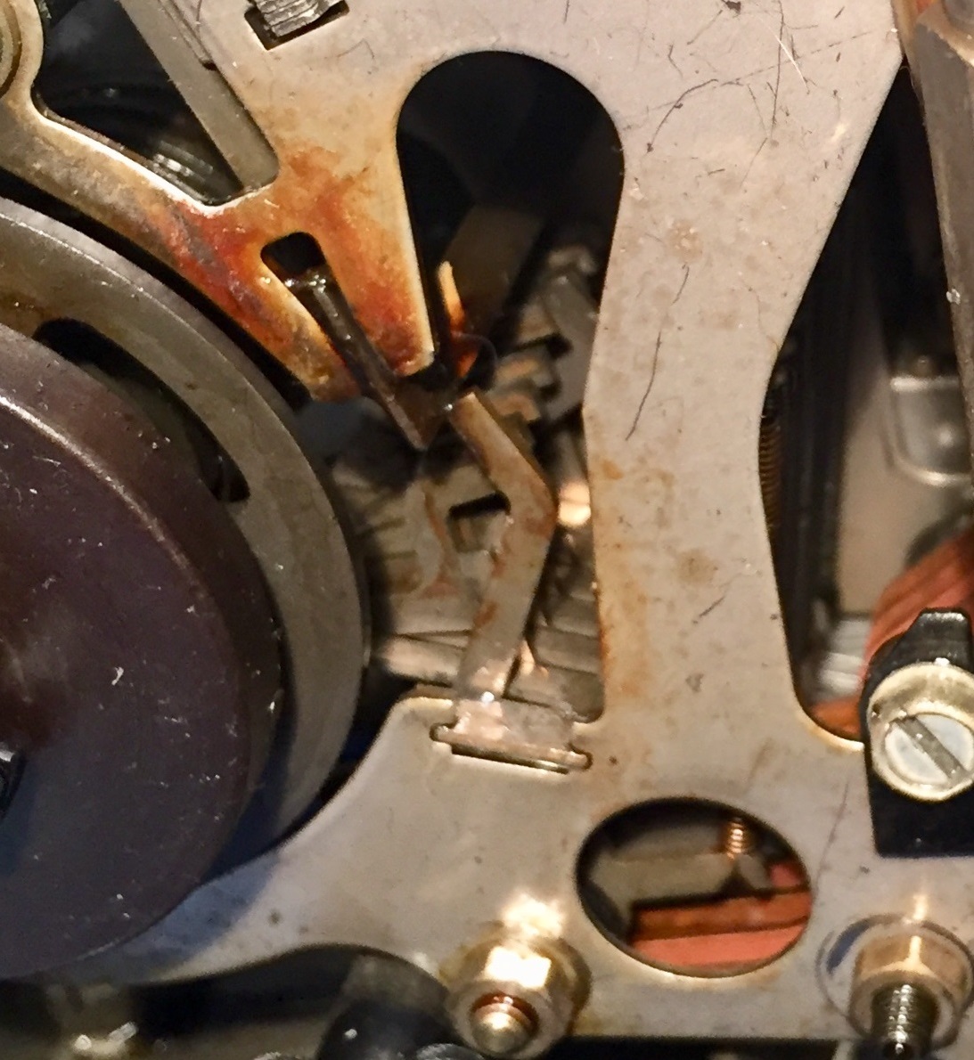 I never did figure out the technique with the spring hooks during the manual selector cycle, but I was able to toggle the selector magnet armature as I very, very slowly advanced the cycle. It gave me a few printable characters, allowing me to confirm that the hammer does slam the type cylinder into the ribbon and paper.
