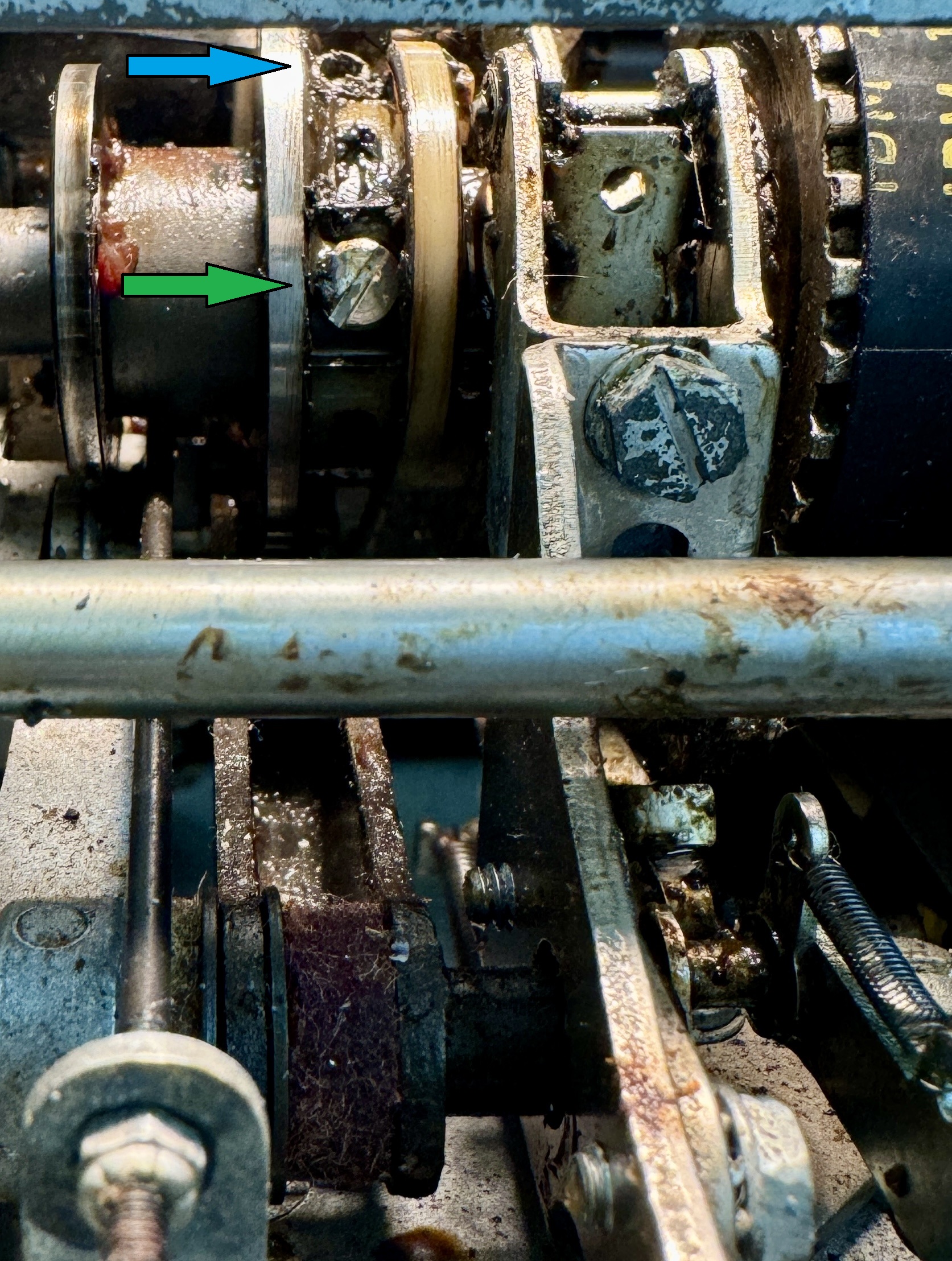 I had to disassemble it in order to clear out the junk and get it lubricated to move freely. Once it was back in the machine, it was time to work on the relative setting of this shaft and the print cycle clutch. When the cycle clutch hits its stop point, the check pawl should have engaged as well but it did not!